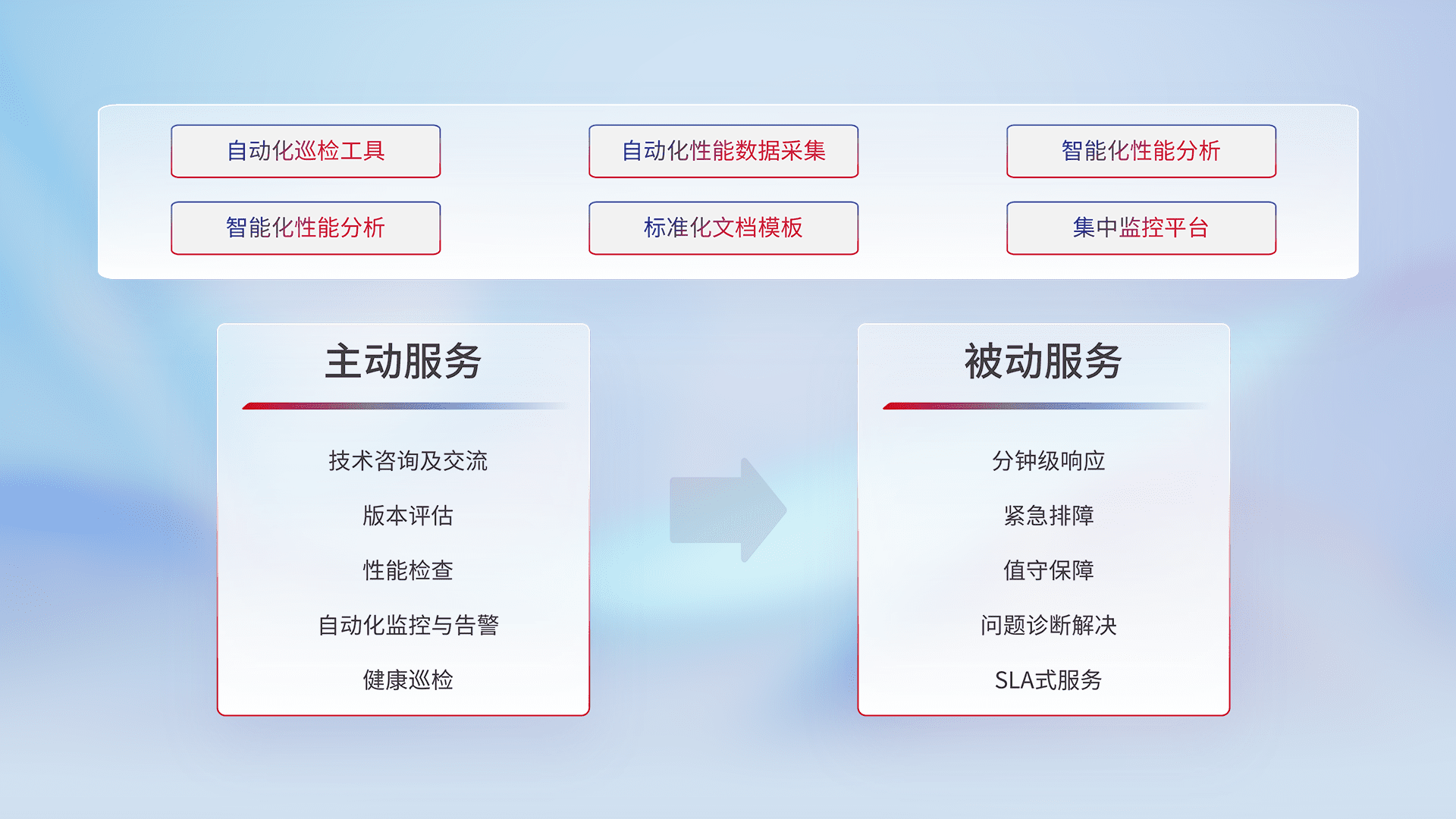 智能化工具和标准化文档,,,保障服务质量,,提供主动服务(包含技术咨询、、版本评估、、、性能检查、、自动化监控与告警、、、、健康巡检)和被动服务包含(分钟级响应、、、、紧急排障、、、值守保障、、问题诊断解决、、、、SLA服务)。。。
